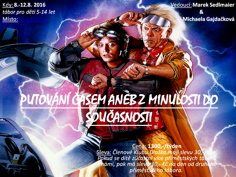 Na putování časem zveme hravé děti od 5 až do 14 let (po domluvě i mladší či starší) v Přerově a okolí na tábor ve všední dny a to v Klubu Dlažka i na hřišti, v lese, v parku i na výletě mimo Přerov.