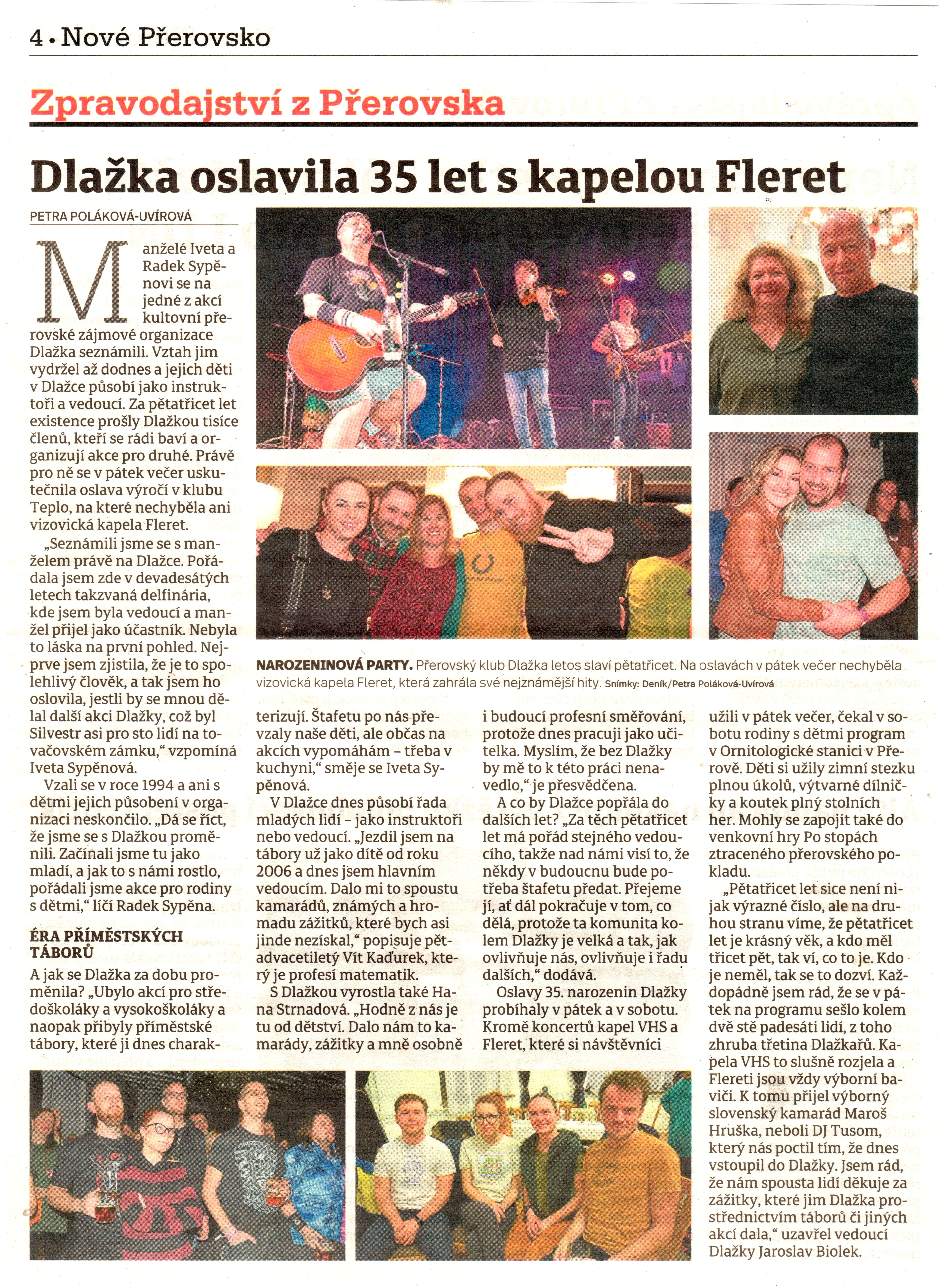 Deník Přerovsko v pátek 31.1.2025 věnoval jednu stránku našim oslavám 35 let Dlažky
